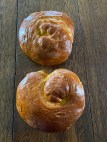 Challah: Challah is a delicious eggy, slightly sweet bread (from honey as well as a little sugar) that is traditionally eaten by Jews on the Sabbath and holidays. It is usually braided except for the New Year, when it is round and studded with raisins. But it is well-known in the larger community as a great bread for eating, for sandwiches and especially, as the best bread in the world to use for French Toast. We do it round or braided, with raisins or without.