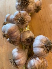 These days we are growing 10 different kinds of garlic. They originally came from different parts of the world, have somewhat different tastes, hotness, looks, and storage capacity. We grow only hardneck garlics, and although they say only softnecks can be braided, we braid ours and leave it up in various parts of the house to dry. It’s all so much nicer than what you get in the supermarket.